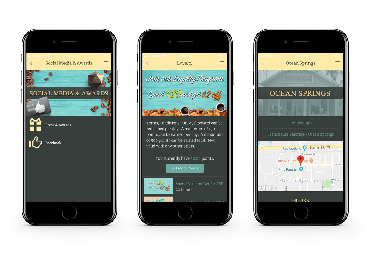 French Kiss Pastries is a small coffee shop located in Ocean Springs, MS. The owner, Jacque, wanted to have an app that had a loyalty/reward program for her clients. The app is fast and dynamic.