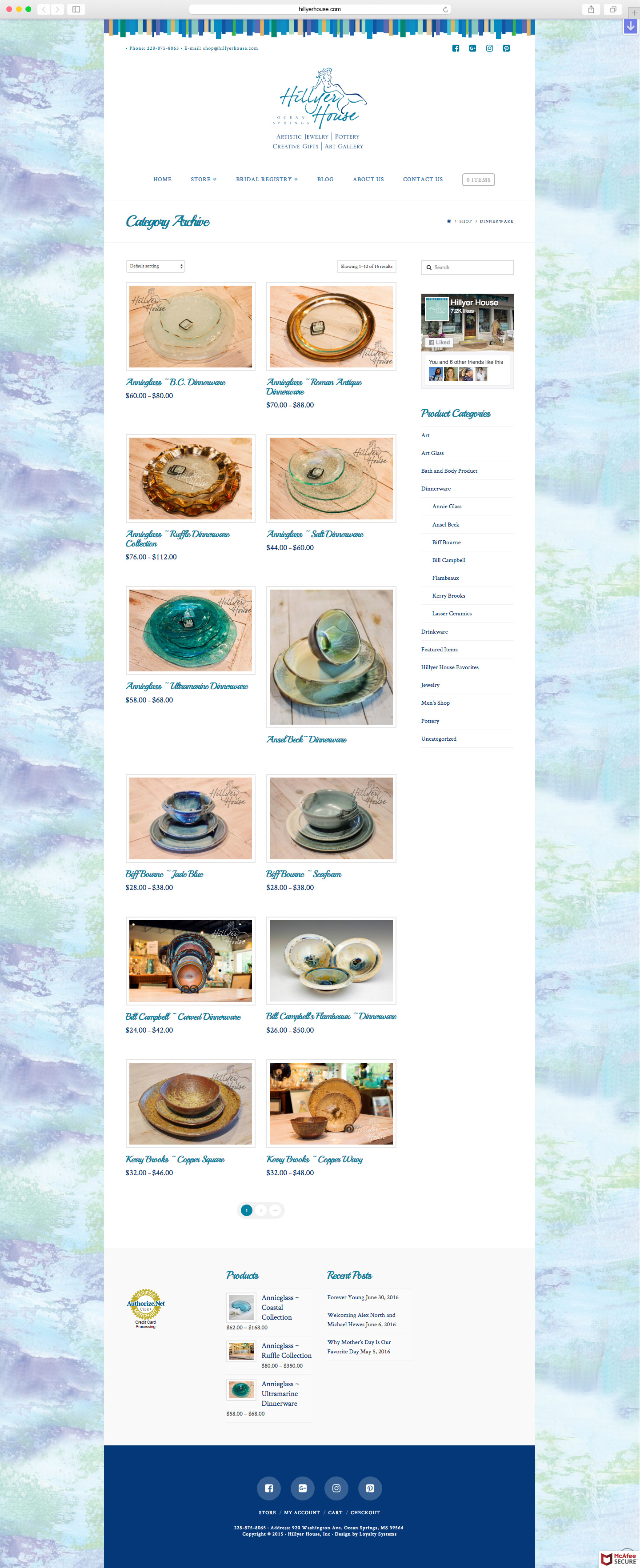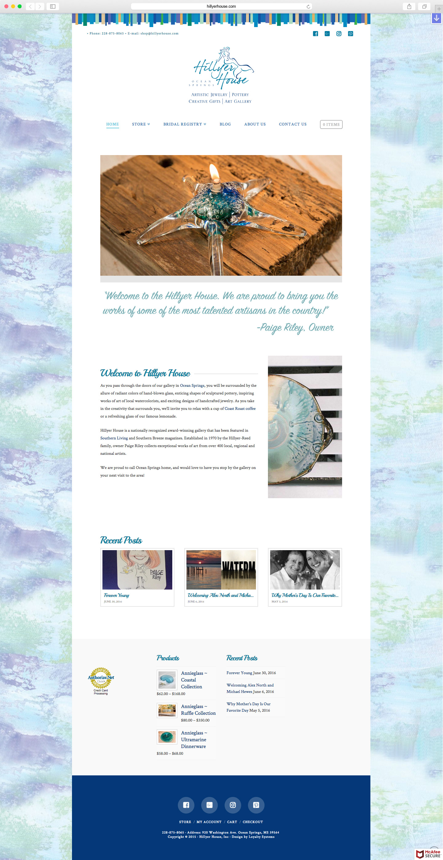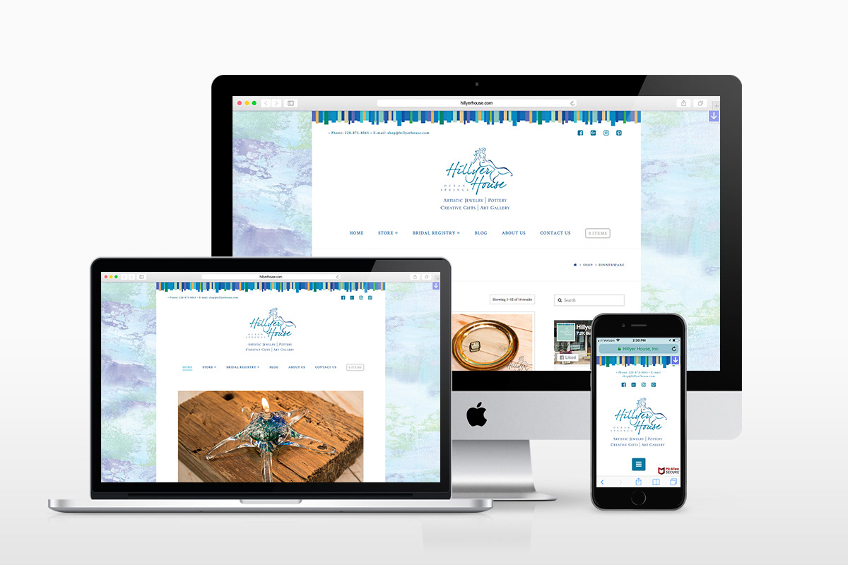 Hillyer House, a renowned gift shop in Ocean Springs, Mississippi, sells jewelry, artwork, pottery and a vast array of other specialty items from some of the best artisans in the country. The website was built on Wordpress and Woocommerce for the E-Commerce functionality.